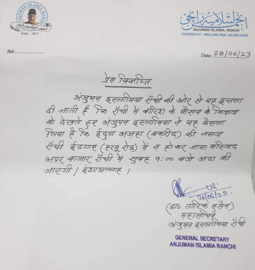 रांची। रांची ईदगाह में बकरीद की नमाज बारिश को लेकर 29 जून को नहीं पढ़ाई जाएगी। अंजुमन इस्लामिया रांची के सचिव तारिक हुसैन ने बताया कि बरसात के मौसम को लेकर कमेटी ने य़ह निर्णय लिया की गुरुवार को बकरीद की नमाज harmu रोड स्थित रांची ईदगाह की बजाय अपर बाजार जामा मस्जिद में सुबह 9 बजे पढ़ाई जाएगी। जानकारी के अनुसार 1860 से 2022 तक ईद और बकरीद का नमाज़ हमेशा रांची ईदगाह में पढ़ा गया। साल में दो बार ही ईदगाह में नमाज़ होती और लोगों में इसकी उत्साह भी होता है। लेकिन इस बार बकरीद की नमाज नहीं होगी।