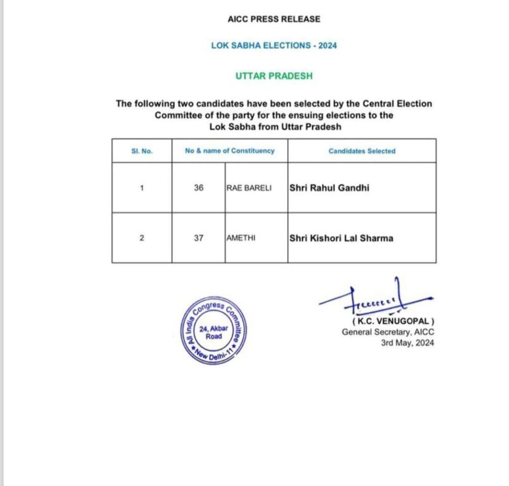 रांची। Lok Sabha Election 2024 के लिए कांग्रेस ने रायबरेली व अमेठी से अपने उम्मीदवार की घोषणा कर दी। राहुल गांधी रायबरेली से और किशोरी लाल शर्मा अमेठी से चुनाव लडेंगे। राहुल गांधी आज ही नामांकन करेंगे। वायनाड व रायबरेली से राहुल गांधी चुनाव लड़ेंगे। वहीं, कांग्रेस की स्टार प्रचारक प्रियंका गांधी चुनाव नहीं लड़ेंगी।