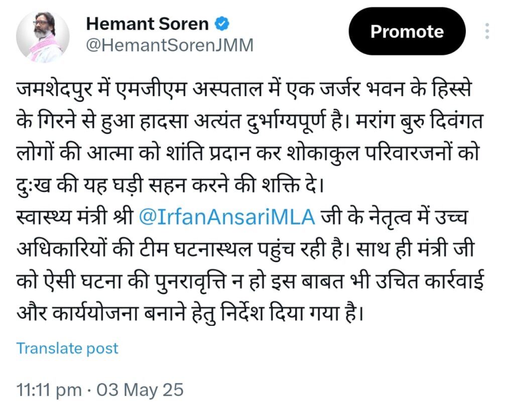 रांची। कोल्हान के सबसे बड़े सरकारी अस्पताल, जमशेदपुर स्थित एमजीएम अस्पताल के बी ब्लॉक का एक हिस्सा गिरने से 2 लोगों की मौत की सूचना है। मौत का आंकड़ा बढ़ भी सकता है। रेस्क्यू अभी भी जारी है। सीएम के निर्देश पर झारखंड के स्वस्थ्य मंत्री इरफान अंसारी व झारखंड के स्वास्थ्य विभाग के प्रधान सचिव अजय कुमार सिंह अस्पताल पहुंचे हैं। मंत्री इरफान अंसारी ने इस घटना को लेकर अस्पताल प्रबंधन से पूरी जानकारी ले रहे हैं। उन्होंने घटना पर गहरा दुख प्रकट किया है। घटना में एक बुजुर्ग महिला समेत दो लोग गंभीर रूप से घायल हुए हैं। प्रत्यक्षदर्शियों ने बताया कि यह इमारत लंबे समय से खस्ताहाल थी, लेकिन मरम्मत के अभाव में मरीजों को वार्ड में रखा जा रहा था। स्थानीय लोगों का कहना है कि इमारत की जर्जर स्थिति को लेकर कई बार अधिकारियों से शिकायत की गई, मगर कोई सुधार नहीं हुआ। घटना तब हुई जब मेडिसिन विभाग के दूसरी मंजिल का एक कॉरिडोर अचानक ढह गया। मलबे में दबे चार मरीजों में से दो को रेस्क्यू टीम ने निकाला, जिनमें एक महिला की हालत नाजुक बताई जा रही है। सीएम हेमंत सोरेन ने X अकाउंट एक पोस्ट कर हादसा पर गहरा दुख जताया है।