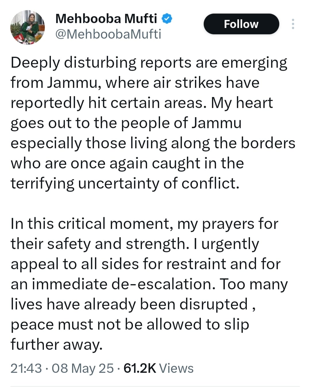 रांची। जम्मू-कश्मीर की पूर्व मुख्यमंत्री महबूबा मुफ्ती ने कहा है कि जम्मू में स्थिति बेहद परेशान करने वाली है। मुफ्ती ने सोशल मीडिया एक्स पर कहा, “जम्मू से बेहद परेशान करने वाली खबरें आ रही हैं, जहां कथित तौर पर कुछ इलाकों में हवाई हमले हुए हैं।” “मेरी संवेदना जम्मू के लोगों के साथ है, खासकर सीमा पर रहने वाले लोगों के साथ, जो एक बार फिर संघर्ष की भयावह अनिश्चितता में फंस गए हैं।”