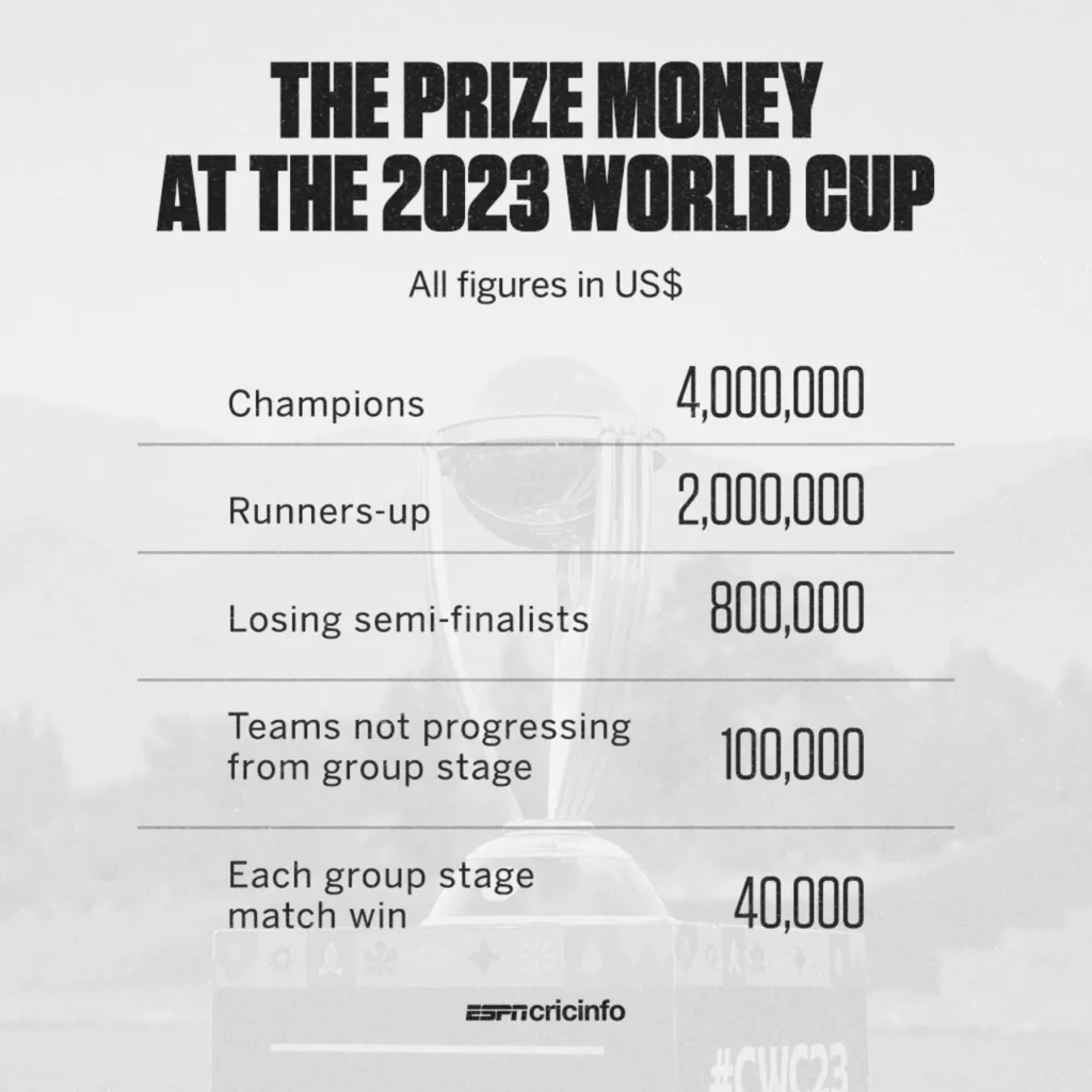 रांची। अगले महीने शुरू होने वाले आईसीसी पुरुष वनडे विश्व कप के विजेता टीम को लगभग 33 करोड़ रुपए (40 लाख डॉलर) की इनामी राशि दी जाएगी। आईसीसी ने 5 अक्तूबर से अहमदबाद में शुरू होने वाली इस प्रतियोगिता के लिए कुल 83 करोड़ रुपए (1 करोड़ डॉलर) की पुरस्कार राशि को तैयार किया है। उपविजेता टीम को भी लगभग 16.5 करोड़ रुपए मिलेंगे। साथ ही सेमी फाइनल तक पहुंचने वाली अन्य दो टीमों को भी 6.6 करोड़ रुपए मिलेंगे। इसके अलावा ग्रुप स्टेज में टूर्नामेंट से बाहर होने वाली अन्य छह टीमों को भी 83 लाख रूपए मिलेंगे। हर मैच के विजेता को भी 3.3 लाख रुपये दिए जाएंगे। भारत इस विश्व कप के लिए मेजबान के तौर पर सीधा क्वालिफाई कर चुका था। इसके अलावा 2020-23 के वनडे सुपर लीग के अपने प्रदर्शन के आधार पर न्यूजीलैंड, इंग्लैंड, बांग्लादेश, पाकिस्तान, ऑस्ट्रेलिया, अफगानिस्तान और ऑस्ट्रेलिया ने भी इस टूर्नामेंट में अपनी जगह पक्की की। श्रीलंका और नीदरलैंड्स इस साल जून-जुलाई में खेले गए क्वालिफायर में खेल के आधार पर इस टूर्नामेंट का हिस्सा बने हैं।