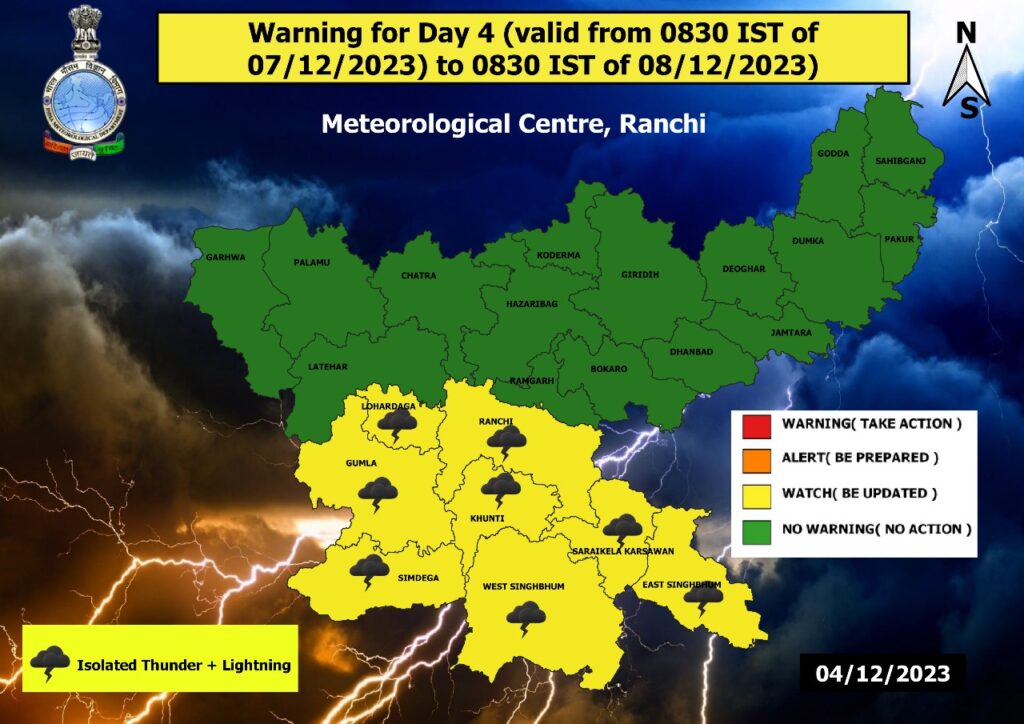मौसम विज्ञान केंद्र, रांची ने कहा कि 6 और 7 दिसंबर को राज्य के कई इलाकों, खासकर दक्षिणी और मध्य भाग में गरज और बिजली गिरने की संभावना है। अभिषेक आनंद ने कहा कि किसान भाई अपनी खरीफ फसलों को सुरक्षित रखें और सब्जियों को खेत से तोड़कर सुरक्षित स्थान पर रख लें।