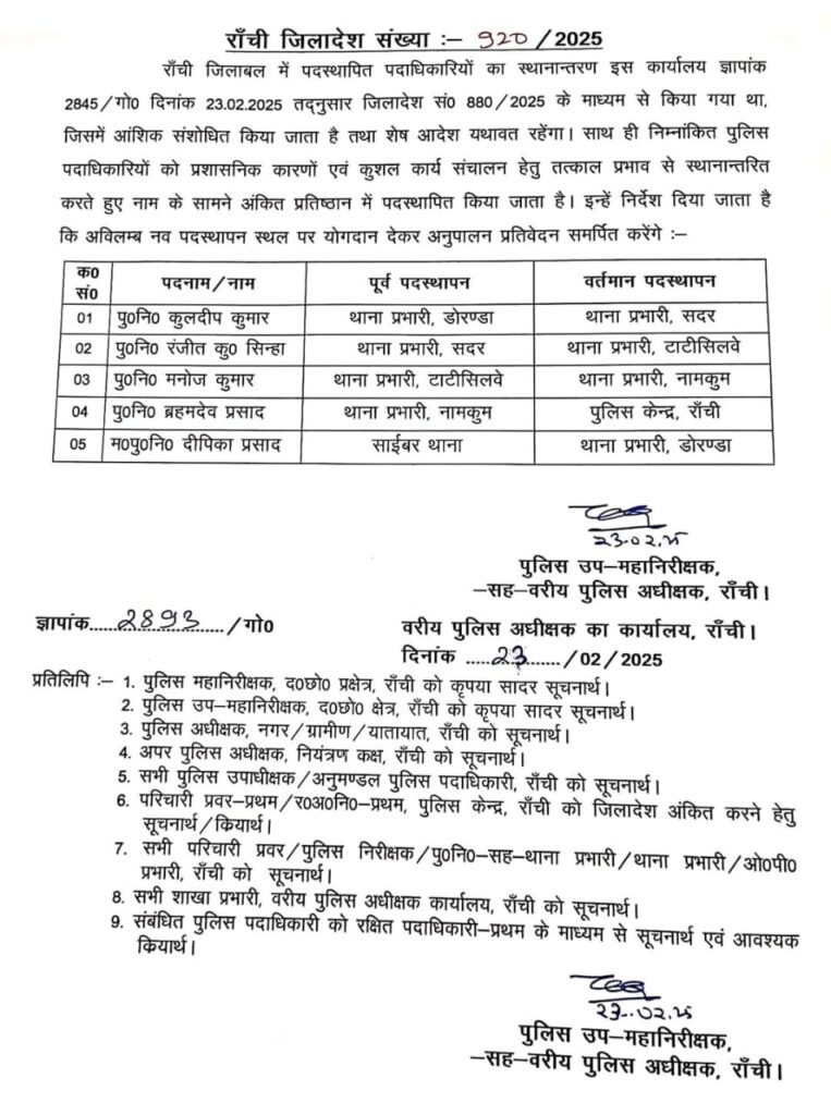 रांची. एक दिन पहले यानी 23 फरवरी को रांची के कई थानेदारों का तबादला किया गया था. अब इसमें आंशिक संशोधित किया गया है. पहले डोरंडा थाना के नए प्रभारी के रूप में संदीप कुमार को जिम्मेदारी दी गई थी. अब इन्हें सदर का थाना प्रभारी फिर से बना दिया गया है. वहीं, डोरंडा थाना में दीपिका प्रसाद को डोरंडा थाना का नया प्रभारी बनाया गया है.