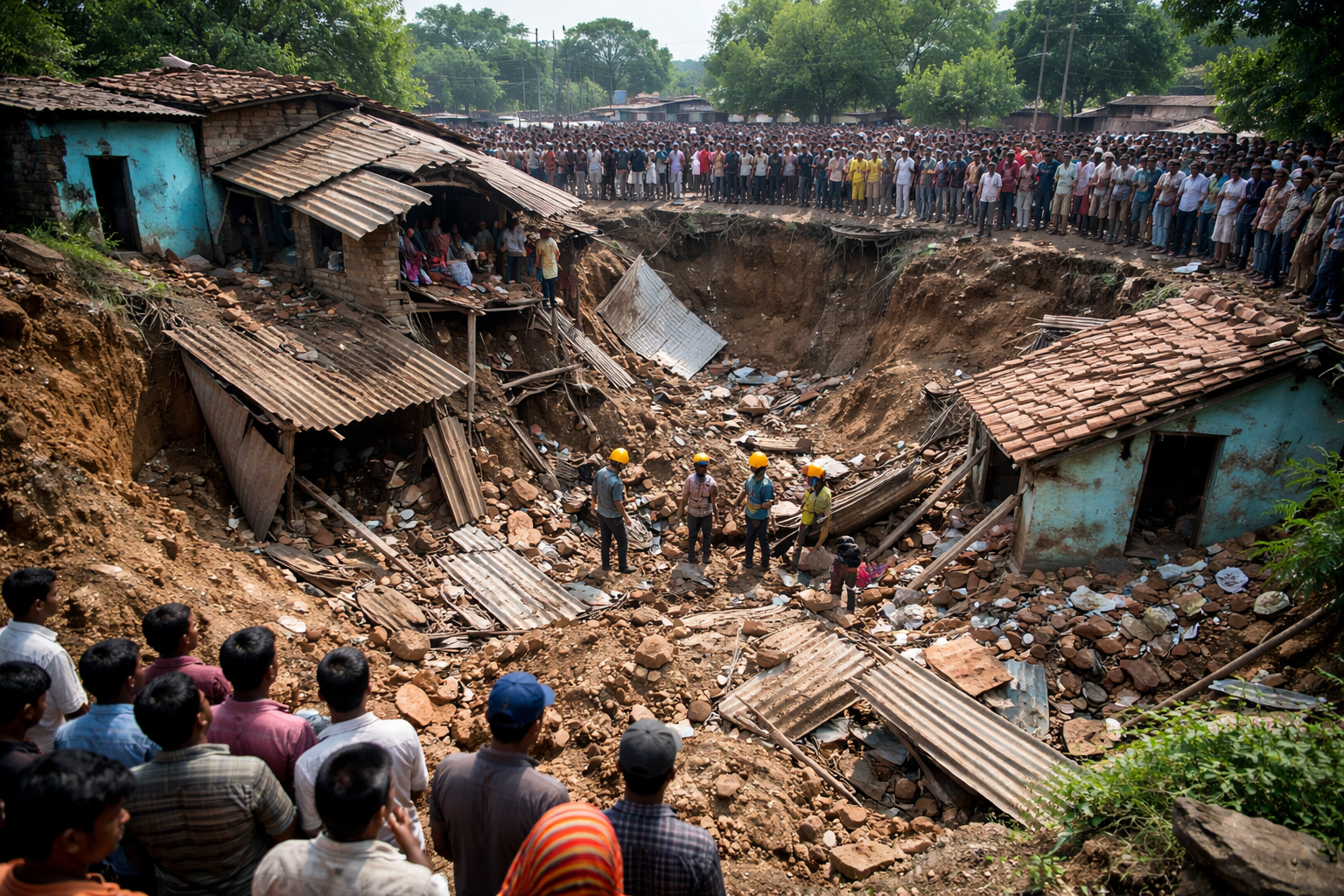 झारखंड के धनबाद के कतरास क्षेत्र में भू-धंसान के बाद ध्वस्त हुए घर, मौके पर मौजूद स्थानीय लोग और चल रहा राहत-बचाव कार्य
