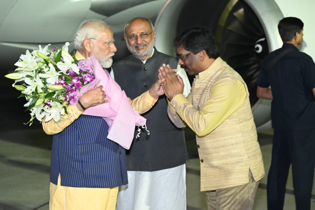 रांची। प्रधानमंत्री नरेंद्र मोदी अपने दो दिवसीय झारखंड दौरे को लेकर 14 नवंबर को रात में रांची पहुंच गए। बिरसा मुंडा एयरपोर्ट पर झारखंड के राज्यपाल सीपी राधाकृष्णन व मुख्यमंत्री हेमंत सोरेन ने पीएम को बुके देकर स्वागत किया। इसके अलावा भाजपा प्रदेश अध्यक्ष, मुख्य सचिव, डीजीपी ने भी स्वागत किया। भारी सुरक्षा के बीच पीएम का काफिला एयरपोर्ट से निकलकर राजभवन पहुंचा। इससे पहले हीनू चौक में पीएम ने अपने गाड़ी से थोड़ी देर रुककर लोगों का अभिवादन स्वीकार किया। हाथ हिलाकर लोगों का जोश बढ़ाया।