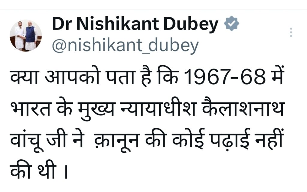 रांची. भारत के चीफ जस्टिस ऑफ इंडिया के खिलाफ टिप्पणी से हंगामा मचाने के बाद भाजपा सांसद निशिकांत दुबे ने पूर्व चुनाव आयुक्त एस वाई कुरैशी पर भी निशाना साधा था. अब फिर निशिकांत दुबे ने एक ट्वीट कर कर हंगामा खड़ा कर दिया है. निशिकांत दुबे ने यह ट्वीट भारत के पूर्व मुख्य न्यायाधीश के बारे लिखा है. अपने ट्विटर हैंडल X पर निशिकांत दुबे ने लिखा कि क्या आपको पता है कि 1967-68 में भारत के मुख्य न्यायाधीश कैलाशनाथ वांचू जी ने कानून की कोई पढ़ाई नहीं की थी. बता दें कि इससे पहले भाजपा सांसद निशिकांत दुबे ने पूर्व मुख्य चुनाव आयुक्त के बारे कहा था कि वह चुनाव आयुक्त नहीं बल्कि एक ‘मुस्लिम आयुक्त’ थे. इससे पहले सुप्रीम कोर्ट और चीफ जस्टिस ऑफ इंडिया संजीव खन्ना पर तीखा हमला बोला था और भारत में ‘धार्मिक युद्ध’ के लिए उन्हें जिम्मेदार ठहराया था.