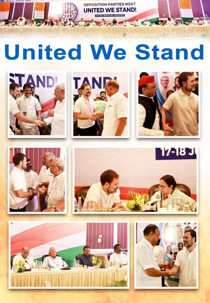 रांची। विपक्षी दलों के नए गठबंधन का नाम इंडियन नेशनल डेवलेपमेंट इंक्लूसिव अलायंस यानी ‘INDIA’ रखा गया है। बंगलुरु में 26 विपक्षी दल एक साथ जुटे और 2024 के लिए नया गठबंधन बनाया। मीटिंग के बाद सभी नेताओं ने एक मंच पर आकर साझा प्रेस कॉन्फ्रेंस की। शुरुआत में कांग्रेस अध्यक्ष खड़गे ने इस गठबंधन के नाम की औपराचिक घोषणा की। उन्होंने बताया कि सभी दलों ने ‘INDIA’ नाम पर सहमति जताई है। इसके बाद खड़गे ने अपनी प्रेस कॉन्फ्रेंस में बैठक को सफल बताते हुए कहा कि अगले चरण की बैठक मुंबई में होगी और 2024 लोकसभा चुनाव के लिए दिल्ली में एक सचिवालय बनाया जाएगा। खड़गे ने कहा कि केंद्र सरकार ED, CBI जैसी संस्थाओं का गलत इस्तेमाल कर रही है।