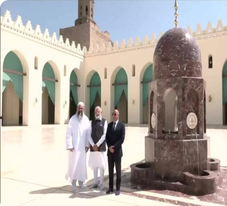 रांची। भारत के प्रधामंत्री नरेंद्र मोदी ने अपने दो दिवसीय मिस्र यात्रा के दौरान काहिरा में अल-हकीम मस्जिद का दौरा किया। अल-हकीम मस्जिद काहिरा में 11वीं सदी का एक ऐतिहासिक मस्जिद है। यह मस्जिद मिस्र व भारत के साझा की गई समृद्ध सांस्कृतिक विरासत के प्रमाण के रूप में खड़ी है। इसके अलावा नरेंद्र मोदी ने मिस्र में हेलियोपोलिस युद्ध कब्र कब्रिस्तान का भी दौरा किया। मोदी ने प्रथम विश्व युद्ध के दौरान सर्वोच्च बलिदान देने वाले भारतीय सैनिकों को श्रद्धांजलि दिए। इन दोनों जगहों का दौरा करने के बाद मिस्र में रह रहे भारतीयों से मुलाकात किए। बता दें कि पीएम नरेंद्र मोदी ने इसी वर्ष गणतंत्र दिवस के अवसर के मुख्य समारोह में मुख्य अतिथि के रूप में मिस्र के राष्ट्रपति को बुलाया था। इसी दौरान पीएम के मिस्र जाने की योजना बनाई गई थी।