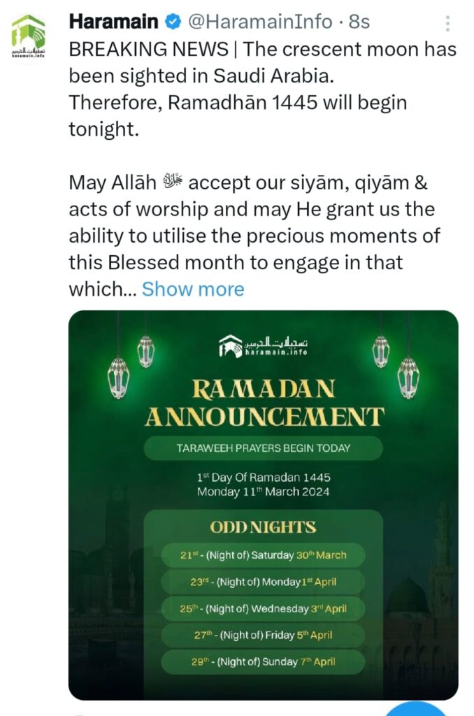 रांची ! आज 10 मार्च रविवार को सऊदी अरब में रमज़ान का चांद नज़र आ गया. कल 11 मार्च यानी सोमवार से रमज़ान का पहला रोज़ा सऊदी अरब में रखा जाएगा. वहीं, इंडिया में पहला रोजा मंगलवार से रखा जाएगा. सोमवार से तरावी शुरू हो जाएगी.