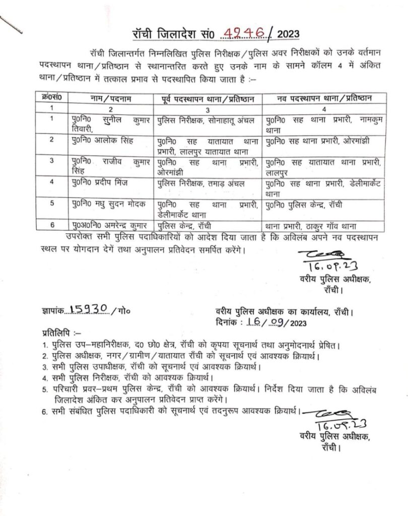 रांची। रांची के ओरमांझी, नामकुम, डेली मार्केट और ठाकुर गांव को नए थाना प्रभारी मिले। इसके अलावा ट्रैफिक थाना लालपुर को भी नए थानेदार मिले। इस संबंध में एसएसपी रांची ने आदेश जारी कर दिया है। सुनील कुमार तिवारी को फिर नामकुम थाना प्रभारी बने हैं। वहीँ, ओरमांझी का थाना प्रभारी आलोक सिंह को बनाया गया है। डेली मार्केट रांची के नए थाना प्रभारी प्रदीप मिंज को बनाया गया है।