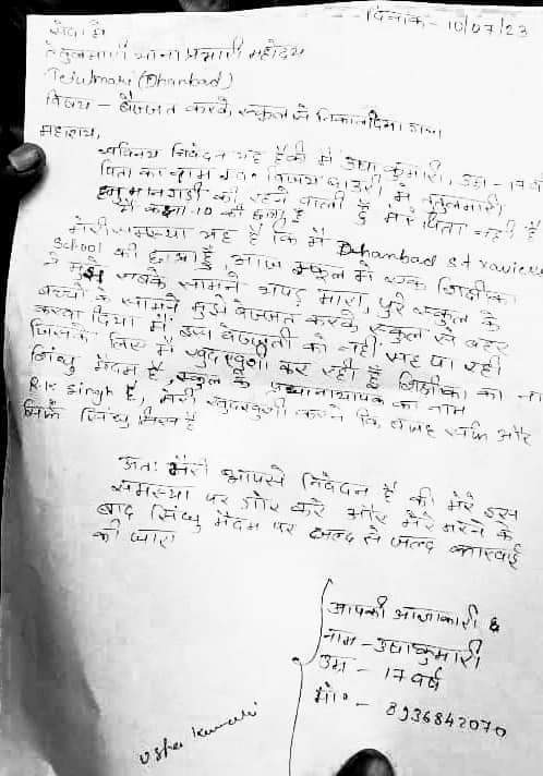 सविनय निवेदन यह है कि मैं उषा कुमारी, उम्र 17 वर्ष, पिता का नाम स्व. विजय बाउरी, तेतुलमारी हनुमानगड़ी की रहने वाली हूं. मेरे पिता नहीं है, मैं कक्षा-10 की छात्रा हूं। मेरी समस्या यह है कि मैं धनबाद संत जेवियर्स स्कूल की छात्रा हूं। आज स्कूल में एक शिक्षिका ने मुझे सबके सामने थप्पड़ मारा, पूरे स्कूल के बच्चों के सामने स्कूल से बाहर कर दिया। मैं इस बेइज्जती को नहीं सह पा रही। जिसके लिए मैं खुदकुशी कर रही हूं। शिक्षिका का नाम सिंधु मैडम है, स्कूल के प्रिंसिपल का नाम आरके सिंह है। मेरी खुदकुशी करने की वजह सिर्फ आैर सिर्फ सिंधु मीस है।