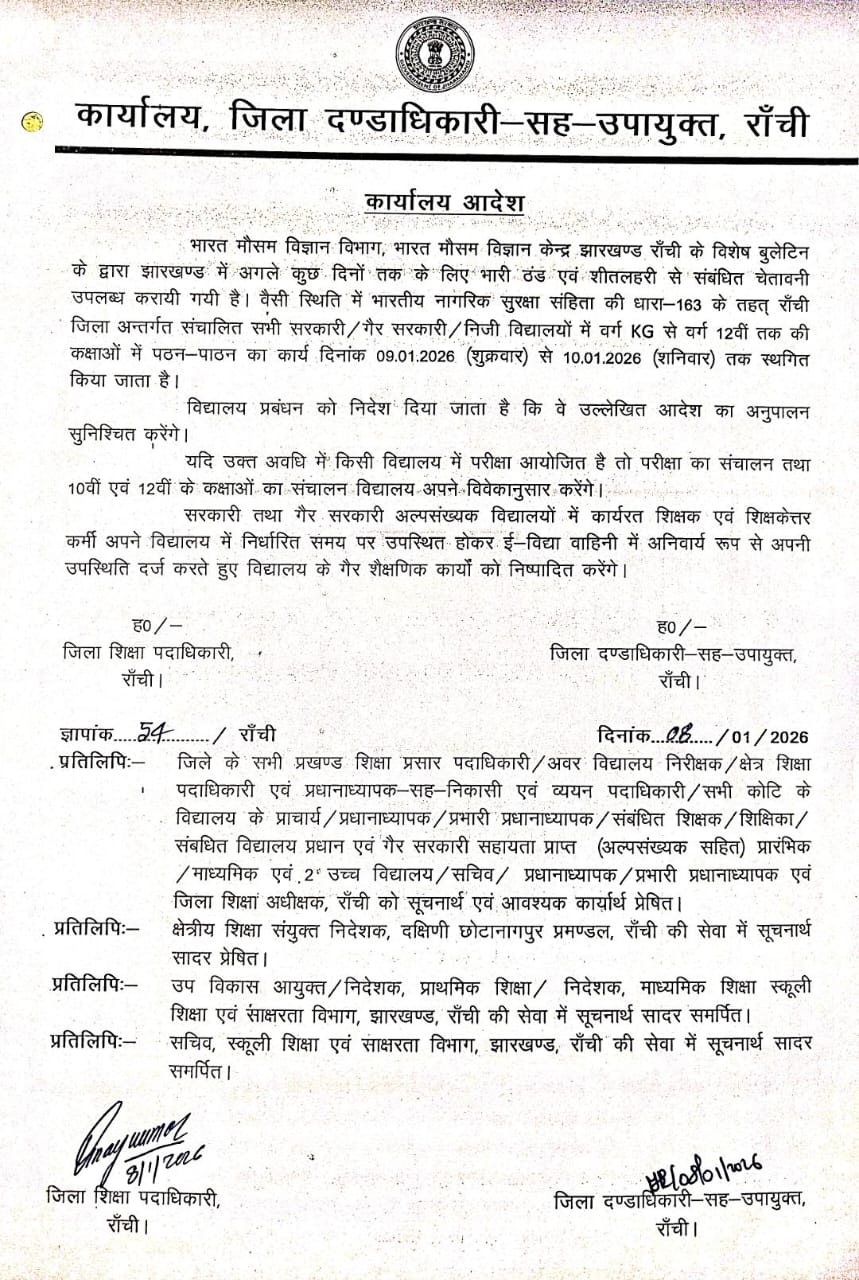 रांची। मौसम विभाग द्वारा जारी शीतलहर एवं ठंड के बढ़ते प्रभाव की चेतावनी के आलोक में रांची उपायुक्त मंजूनाथ भजन्त्री द्वारा जिले में संचालित सभी कोटि के विद्यालयों में कक्षाएं बंद रखने का आदेश जारी किया गया है। आदेश के अनुसार रांची जिले के अंतर्गत संचालित सभी सरकारी, गैर सरकारी सहायता प्राप्त, गैर सहायता प्राप्त (अल्पसंख्यक सहित) एवं सभी निजी विद्यालयों में वर्ग-KG से लेकर वर्ग-12वीं तक की कक्षाएं दिनांक 9 जनवरी 2026 से 10 जनवरी 2026 तक बंद रहेंगी। हालांकि, सभी कोटि के सरकारी विद्यालयों में कार्यरत शिक्षक एवं शिक्षकेतर कर्मी उक्त अवधि में ई-विद्यावाहिनी में अनिवार्य रूप से अपनी उपस्थिति दर्ज करते हुए गैर-शैक्षणिक कार्यों का निष्पादन सुनिश्चित करेंगे। साथ ही यह भी निर्देश दिया गया है कि यदि उक्त अवधि के दौरान किसी विद्यालय में अनिवार्य परीक्षाएं निर्धारित हैं, तो उनके संचालन के संबंध में संबंधित विद्यालय अपने विवेकानुसार निर्णय लेंगे। यह निर्णय विद्यार्थियों के स्वास्थ्य एवं सुरक्षा को ध्यान में रखते हुए लिया गया है, ताकि शीतलहर के कारण होने वाली संभावित परेशानियों से बच्चों को सुरक्षित रखा जा सके।