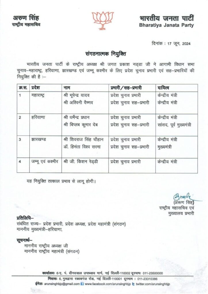 रांची। भारतीय जनता पार्टी के राष्ट्रीय अध्यक्ष जगत प्रकाश नड्डा ने आगामी विधानसभा चुनाव को लेकर चुनाव प्रभारी व सह परभारी की नियुक्ति की है। झारखंड में होने वाले विधानसभा चुनाव को लेकर केंद्रीय कृषि मंत्री शिवराज सिंह चौहान व असम के सीएम हिमंता विश्वा सरमा को जिम्मेदारी सौंपी गई है।