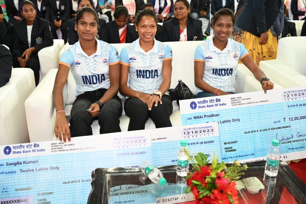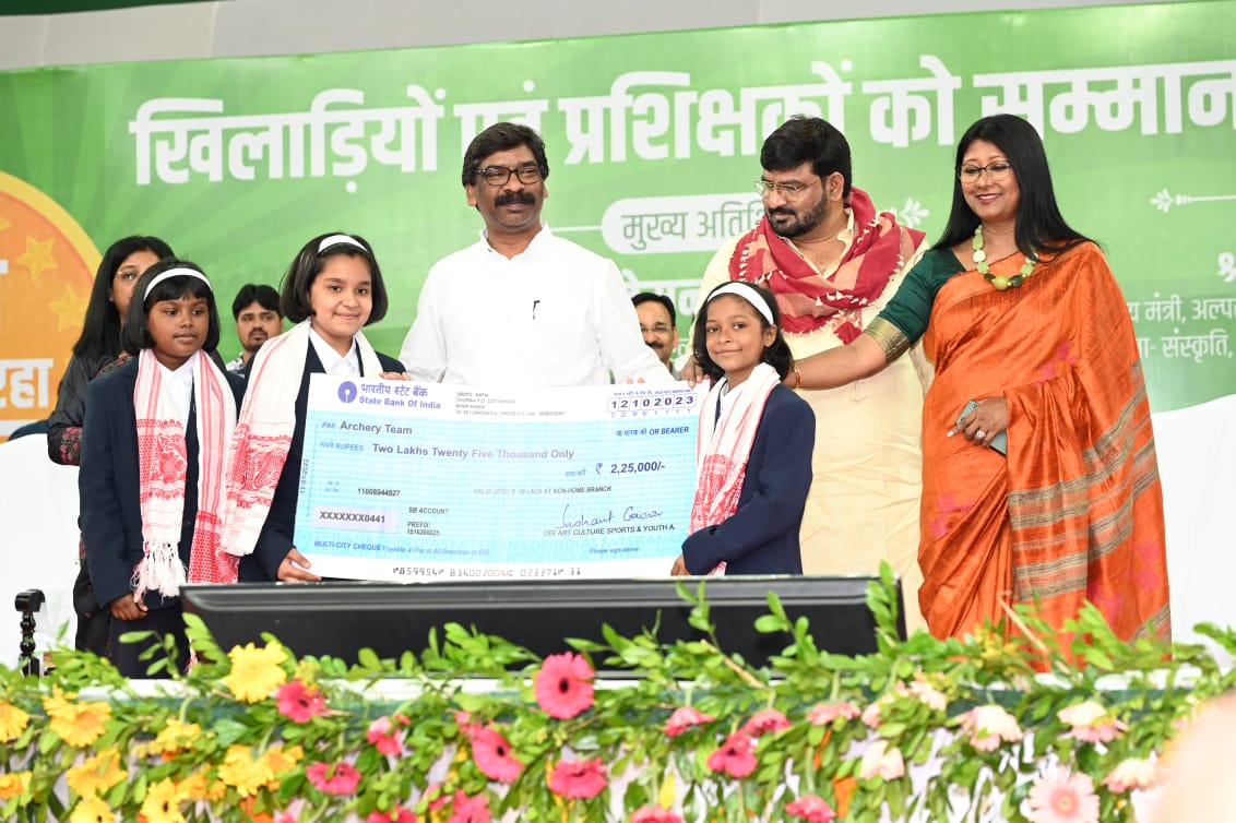 वर्ष 2022-23 और 2023-24 के लिए अलग-अलग इवेंट में पदक जीतने वाले 222 खिलाड़ियों के बीच 4 करोड़ 46 लाख 20 हजार रुपए सम्मान राशि वितरित की गई। इसके अलावा साल 2022-23 के लिए कुल 52 खेल प्रशिक्षकों के बीच 48 लाख 30 हजार रुपए पुरस्कार राशि बांटी। नकद पुरस्कार राशि वितरण समारोह का आयोजन हरिवंश टाना भगत इंडोर स्टेडियम में किया गया। 222 खिलाड़ियों को सम्मान रााशि देकर सम्मानित किया गया। पुरस्कार के लिए जिन 222 खिलाड़ियों का चयन हुआ, उनमें सबसे ज्यादा राशि लॉन बॉल के खिलाड़ियों में रूपा रानी तिर्की, लवली चौबे, चंदन कुमार सिंह, सुनील बहादुर और दिनेश कुमार को दिया गया। रूपा रानी तिर्की को कुल 47 लाख रु., लवली चौबे को 47 लाख रु., चंदन सिंह को 28 लाख रु., सुनील बहादुर को 28 लाख रु. और दिनेश कुमार को 28 लाख रु. बतौर नकद पुरस्कार से नवाजा गया। सीएम ने रूपा रानी तिर्की व लवली आनंद को पुरस्कार राशि देकर सम्मानित किया। इसके अलावा चीन के हांगझाऊ में हुए एशियन गेम्स के महिला हॉकी में ब्रांज मेडल जीतने वाली झारखंड की सलीमा, निक्की व संगीता को 12-12 लाख रूपए दिए गए। वहीं, सीएम ने अंडर-9 राष्ट्रीय तीरंदाजी में सोना जीतने वाली 3 बच्चियों को भी अपने हाथों से सम्मान राशि देकर सम्मानित किया।