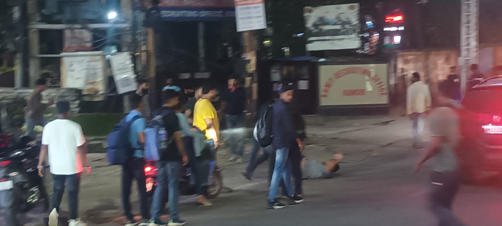 रांची। रात के करीब 10 बजे ओवर ब्रिज के पास अफरा-तफरी का माहौल बन गया। एक छोर के रास्ते पर गाड़ियां रूक गई। मंगलवार की रात सेना भर्ती कार्यालय के सामने बीच सड़क पर एक लड़के को 10-12 लोग मारपीट करने लगे। इस घटना को देख थोड़े देर के लिए अफरा तफरी मच गई। इस मारपीट की घटना को देख लोग दंग रह गए। लात, घुसे, बेल्ट व डंडे से एक लड़के को बुरी तरह से मारा जा रहा था। लोग इस घटना को देख रहे थे, लेकिन किसी में इतनी हिम्मत नहीं हुई की इस लड़ाई को छुड़ा सकें । क्योंकि मारने वालों की संख्या ज्यादा थी। उस लड़के को बीच रास्ते पर लेटा कर लात-घूसे से मारा जा रहा था। लड़का बचाव.. बचावा कह रहा था। वो दर्द से छटपटा रहा था। लेकिन हैवानों की तरह झुंड में लड़के मारे जा रहे थे। आते-जाते लोग इस मारपीट की घटना को देखकर आगे निकल जा रहे थे। जानकारी के अनुसार घायल लड़के को पीसीआर अपने साथ लेकर चली गई। इस संबंध में चुटिया थाना प्रभारी ने बताया कि अभी तक किसी ने रिपोर्ट नहीं लिखाई है।