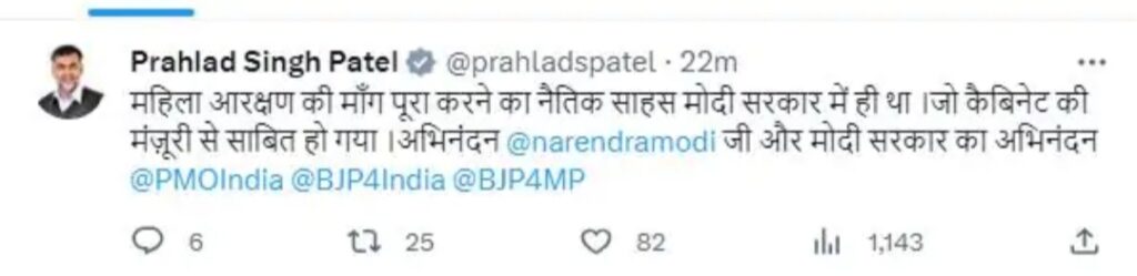 रांची। केंद्रीय मंत्रिमंडल की बैठक में महिला आरक्षण बिल को मंजूरी दे दी गई है। इस बिल को लेकर कई तरह के कयास लगाए जा रहे थे। लेकिन तमाम कयासों को दरकिनार करते हुए केंद्रीय कैबिनेट ने आखिरकार इस बिल को मंजूरी दे दी। मीडिया रिपोर्ट के अनुसार बिल में महिलाओं को 33 प्रतिशत आरक्षण देने प्रावधान है। हालांकि इसको लेकर कोई ब्रीफिंग नहीं की गई है। केंद्रीय मंत्रिमंडल की बैठक में पीएम नरेंद्र मोदी के अलावा कई मंत्री शामिल हुए। मिली जानकारी के अनुसार कल यानि 19 सितंबर को नई संसद भवन में महिला आरक्षण बिल को पेश किया जाएगा। संसद के विशेष सत्र के बीच कैबिनेट की अहम बैठक हुई। सूत्रों की मानें तो इस बैठक में महिला आरक्षण बिल को मंजूरी मिल गई है। केंद्रीय मंत्री प्रह्लाद सिंह पटेल ने X पर पोस्ट किया, महिला आरक्षण की माँग पूरा करने का नैतिक साहस मोदी सरकार में ही था, जो कैबिनेट की मंज़ूरी से साबित हो गया। प्रधानमंत्री नरेंद्र मोदी को बधाई और मोदी सरकार को बधाई।
