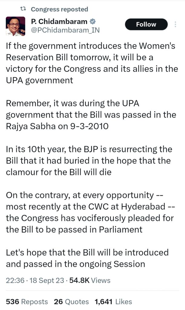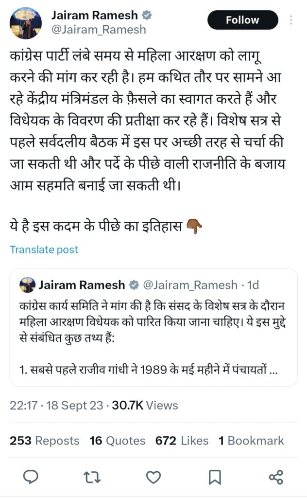 कॉंग्रेस महिला आरक्षण के समर्थन में
